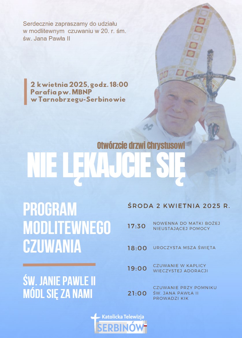 Serdecznie zapraszamy do wspólnego przeżycia modlitewnego czuwania w 20. rocznicę śmierci św. Jana Pawła II. Wydarzenie odbędzie się 2 kwietnia 2025 roku o godz. 18:00 w Parafii pw. Matki Bożej Nieustającej Pomocy w Tarnobrzegu-Serbinowie.