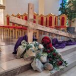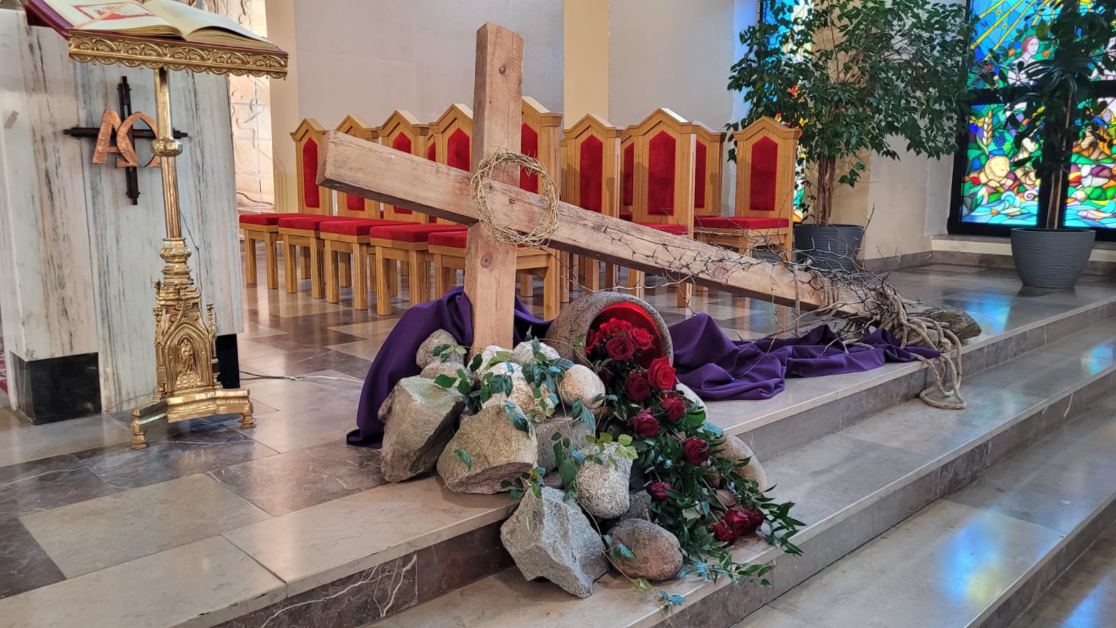 Wielki Post to czas szczególnej refleksji i przygotowania do obchodów Zmartwychwstania Pańskiego, a nasze dekoracje w kościele doskonale oddają ducha tego okresu. Na zdjęciach widzimy minimalistyczną aranżację, w której dominuje fioletowy kolor – symbol pokuty i modlitwy. Drewniany krzyż, opleciony gałązkami i otoczony kamieniami oraz czerwonymi różami, został umieszczony w bocznej części prezbiterium, tworząc przestrzeń do kontemplacji męki Chrystusa. Fioletowe draperie i skromne dodatki, jak wianki, podkreślają powagę tego czasu, zachęcając wiernych do skupienia się na duchowym wymiarze Wielkiego Postu.