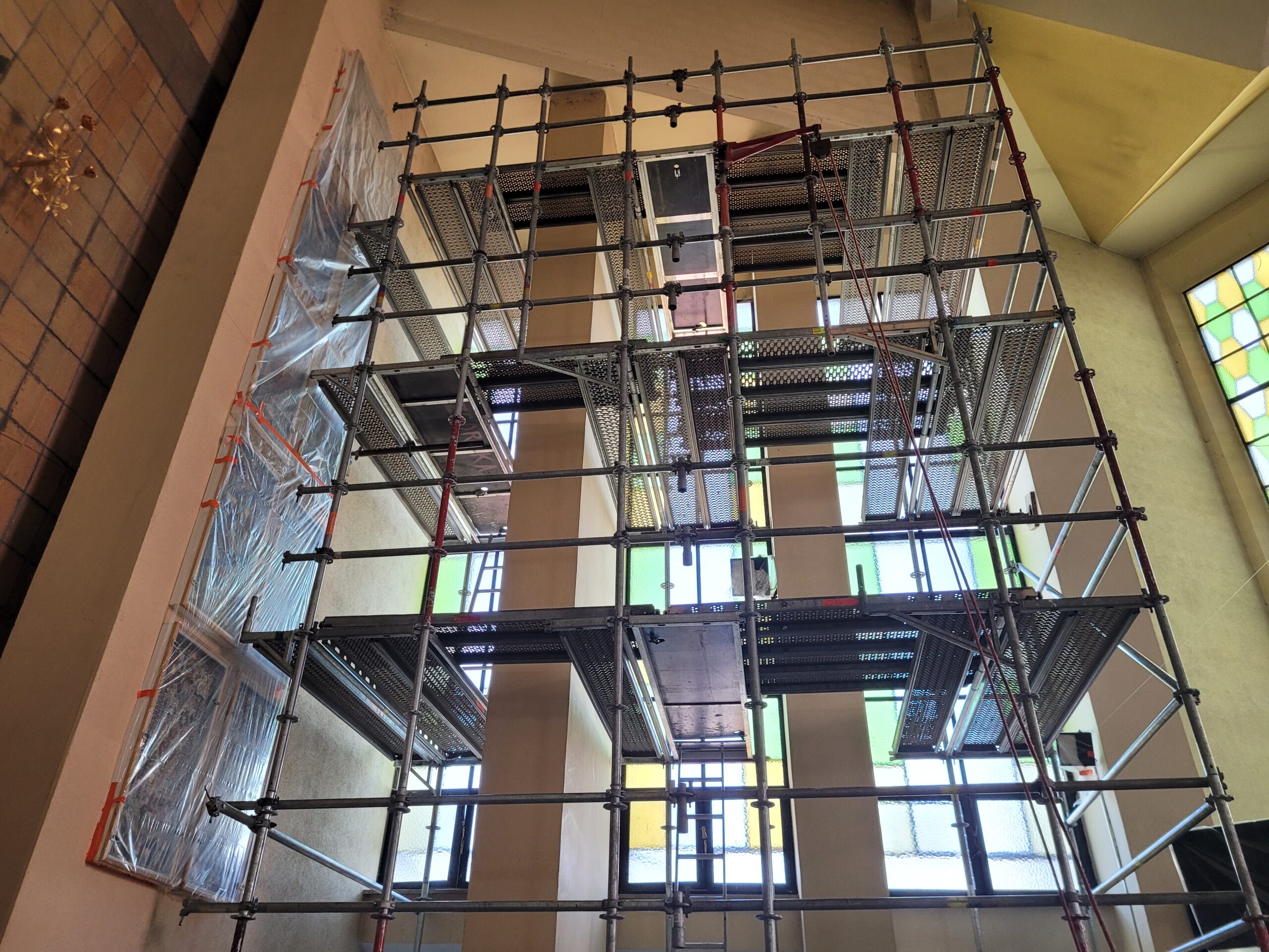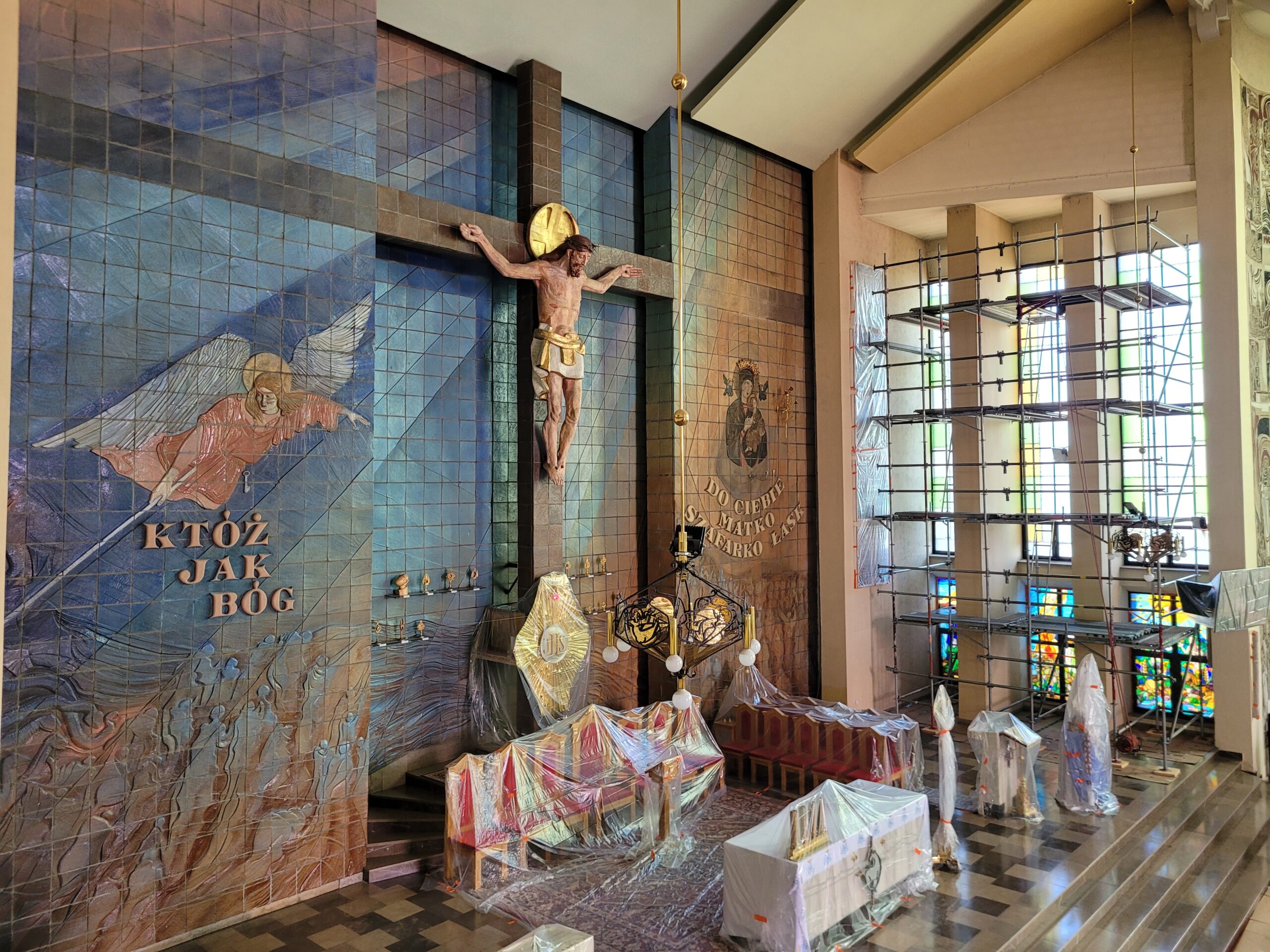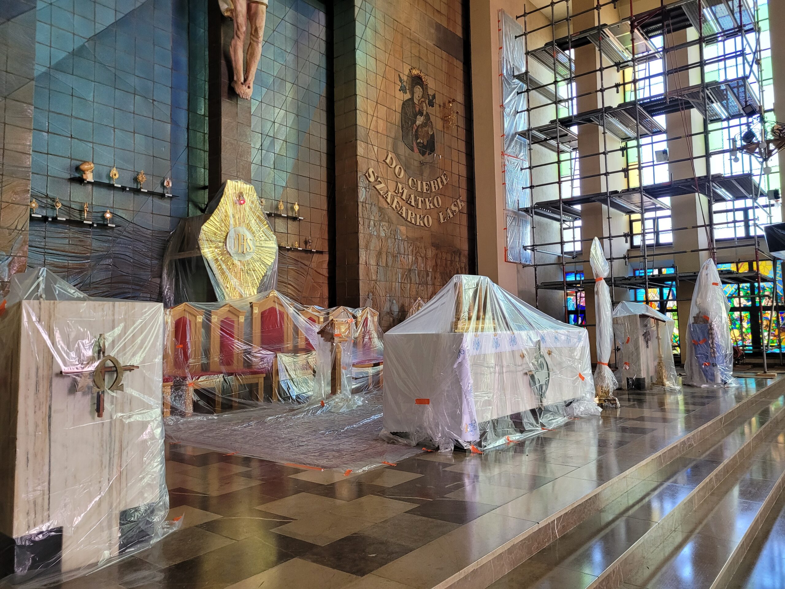 Głównym zadaniem realizowanym we wnętrzu kościoła jest montaż nowych witraży w prezbiterium. Zastępują one dotychczasowe przeszklenia i wprowadzają nową tematykę ikonograficzną. Witraże będą przedstawiać trzy sceny. Pierwsza z nich to Nawiedzenie Najświętszej Maryi Panny przez Archanioła Gabriela. Kolejne okna ukażą postać Św. Jana Chrzciciela trzymającego Baranka oraz Archanioła Rafała prowadzącego dziecko.