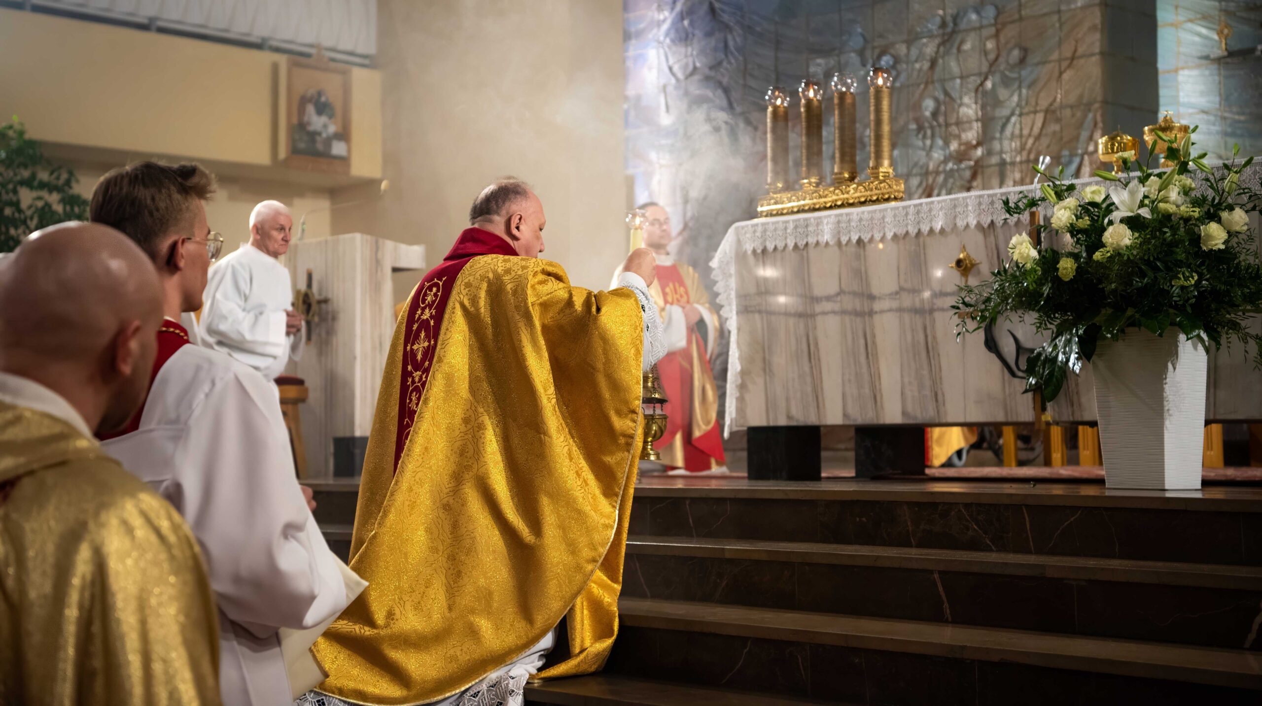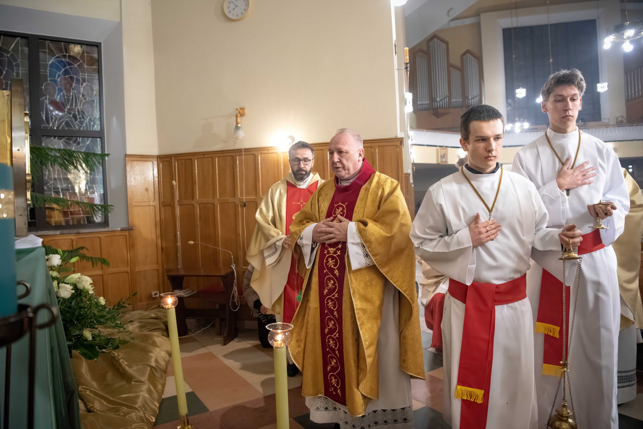 Mszy świętej przewodniczył Ks. prał. Jan Biedroń. W modlitwie brali udział kapłani pracujący w parafii oraz ks. Stanisław Knap z Hospicjum im. św. Ojca Pio. Duchowo z obecnymi łączył się ks. Krzysztof Kula, który przebywa w tym hospicjum. W liturgii uczestniczyła służba ołtarza, Bractwo św. Józefa oraz Rycerze Kolumba. O oprawę muzyczną zadbał organista p. Andrzej Kasperski wraz z chórem. Po odśpiewaniu hymnu „Chwała na wysokości Bogu” i wysłuchaniu czytań, Ksiądz Proboszcz wygłosił homilię. Bezpośrednio po niej kapłani odnowili swoje przyrzeczenia, a następnie odbył się obrzęd obmycia nóg dwunastu mężczyznom. Na zakończenie Najświętszy Sakrament został przeniesiony do Ciemnicy.