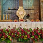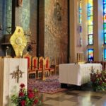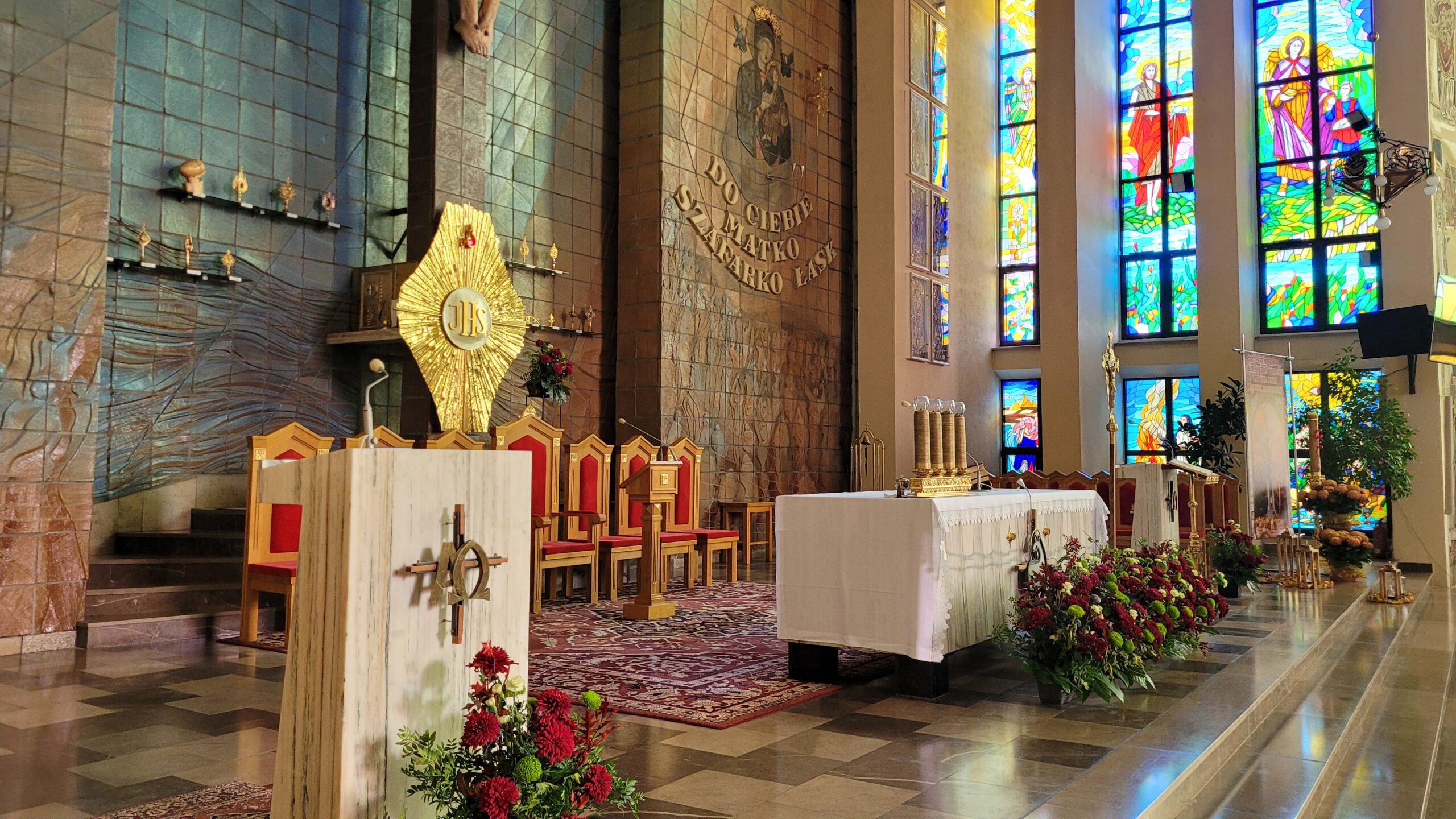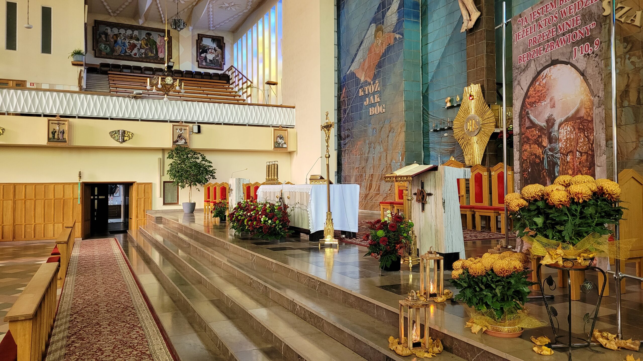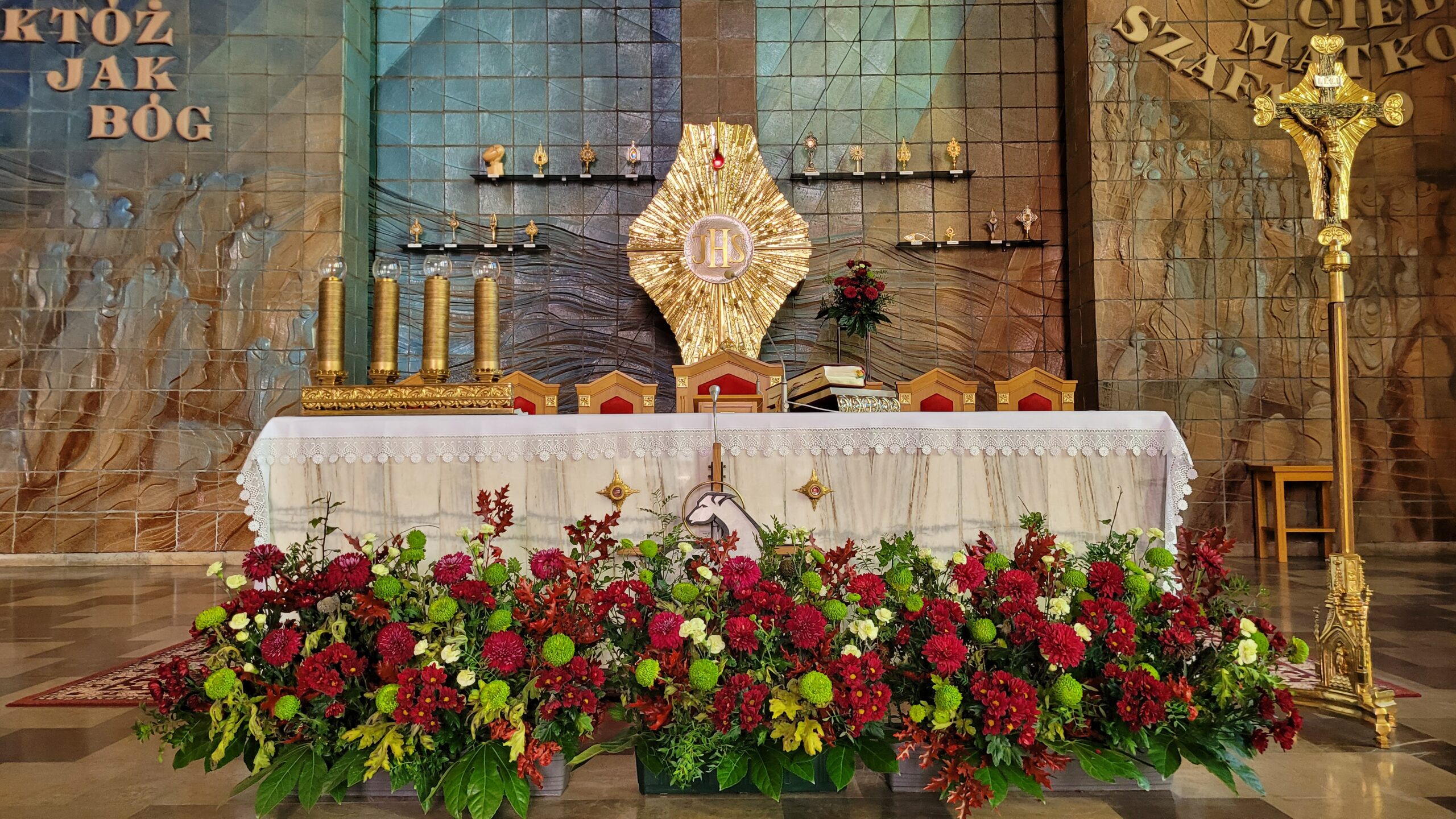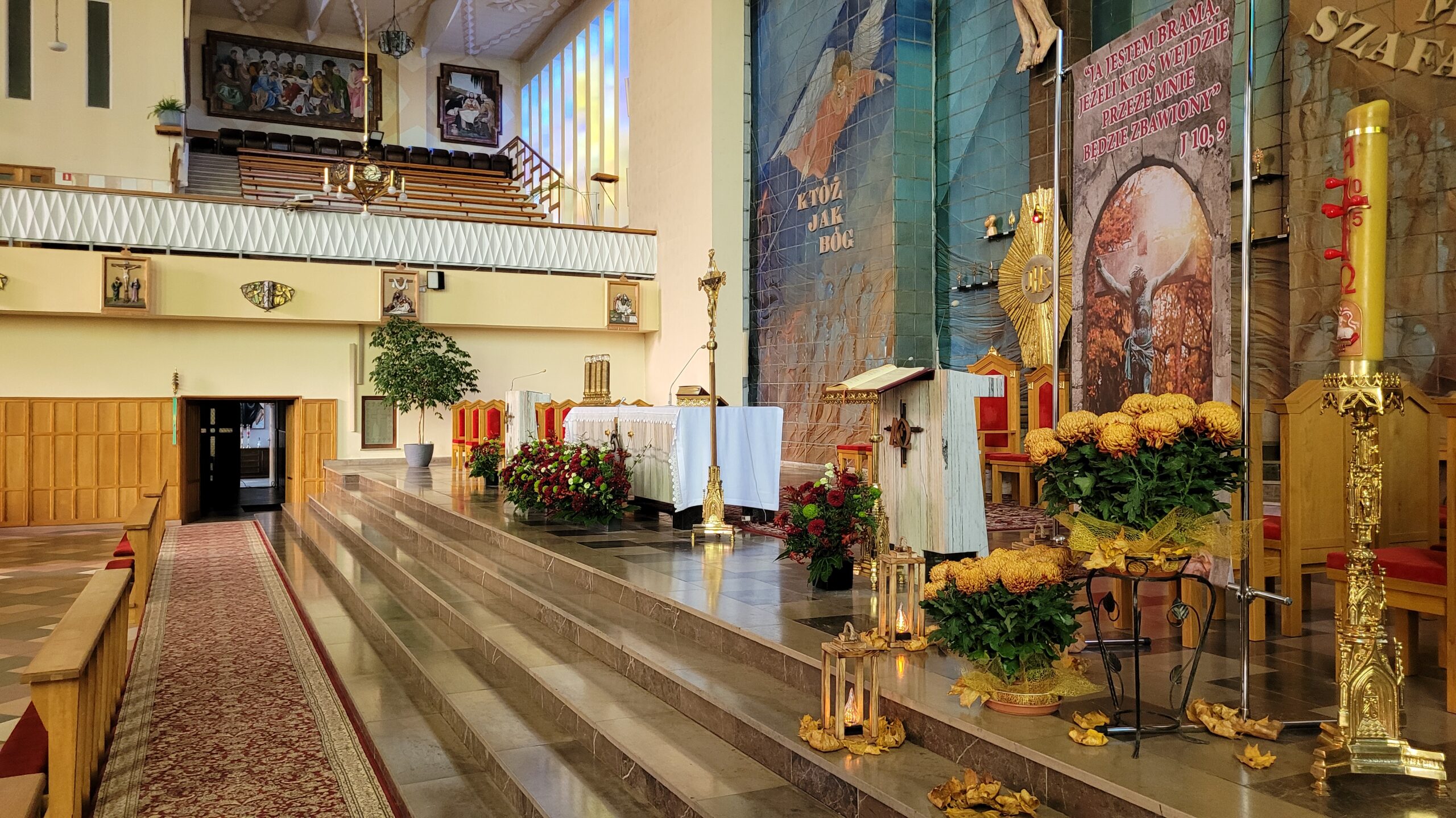 Przed ołtarzem głównym ustawiono kompozycje kwiatowe, składające się głównie z chryzantem. Na stopniach prowadzących do ołtarza umieszczono donice z kwiatami, a także drewniane lampiony ze świecami oraz jesienne liście. Obok ambony stanął baner z cytatem z Ewangelii św. Jana: „Ja jestem bramą. Jeżeli ktoś wejdzie przeze mnie, będzie zbawiony. J 10,9”.