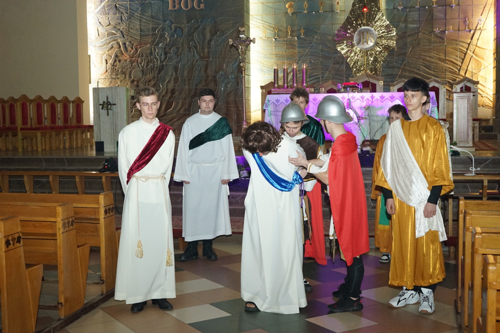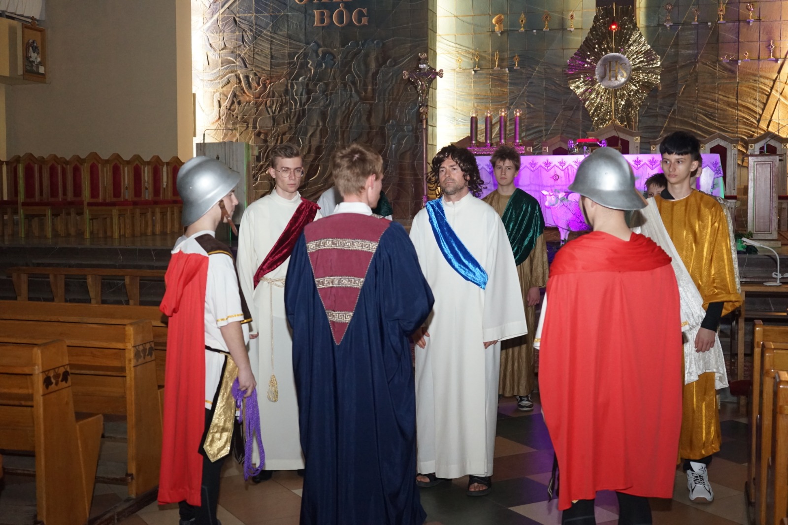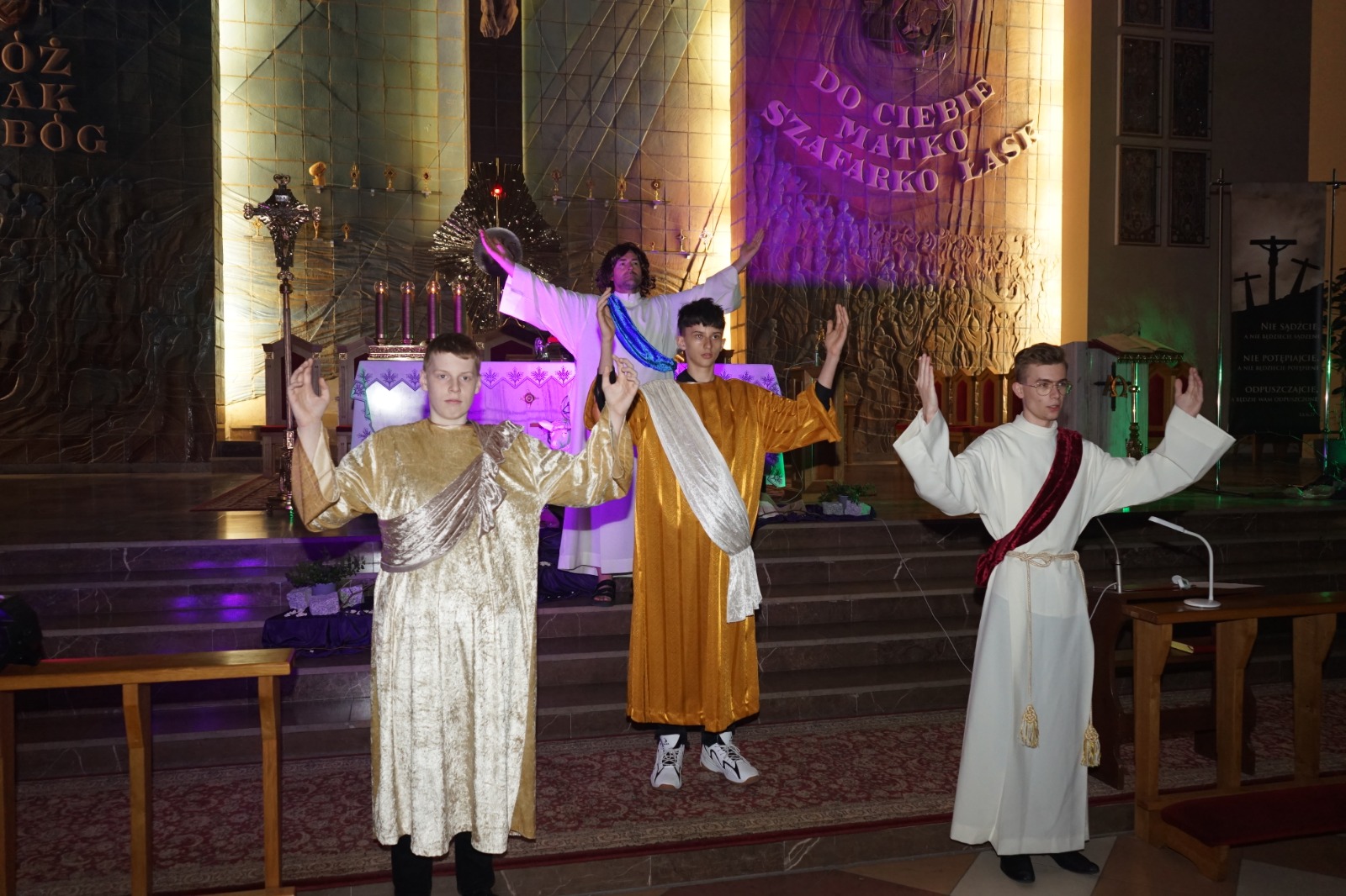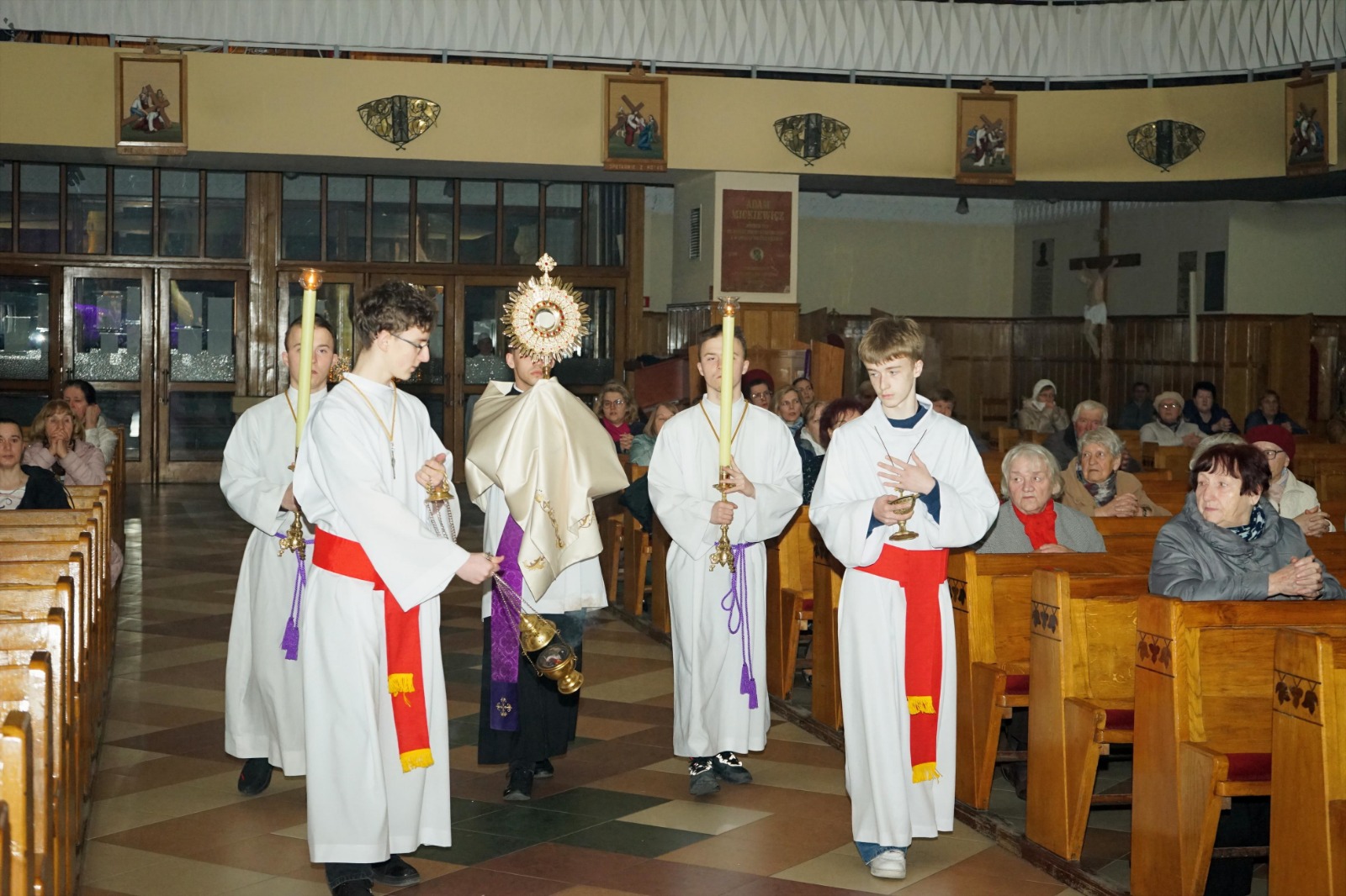 Po zakończeniu tych prezentacji, diakon Przemysław Kotuła wyniósł Najświętszy Sakrament do adoracji. Całość wieczoru uwielbienia została przygotowana przez ks. Adriana Kalka wraz z Liturgiczną Służbą Ołtarza. Oprawę muzyczną wydarzenia poprowadziła schola, a w śpiew włączyli się również księża naszej parafii: ks. Andrzej Cag, ks. Krzysztof Mikulski oraz ks. Rafał Choda.