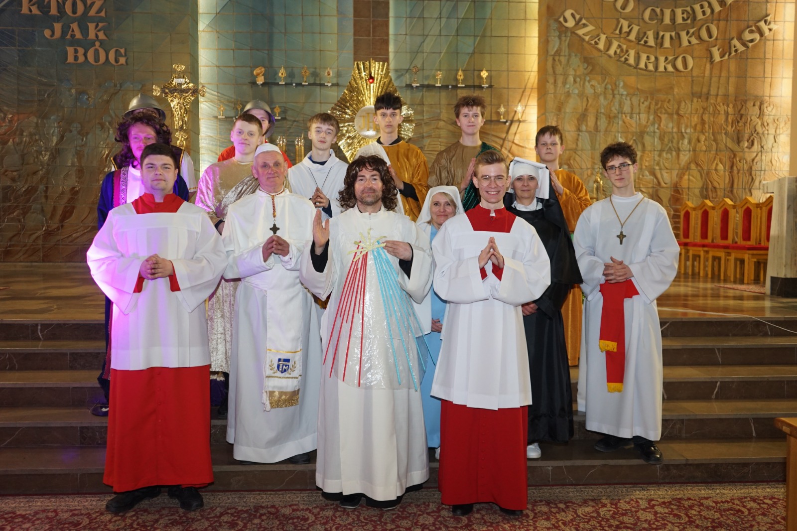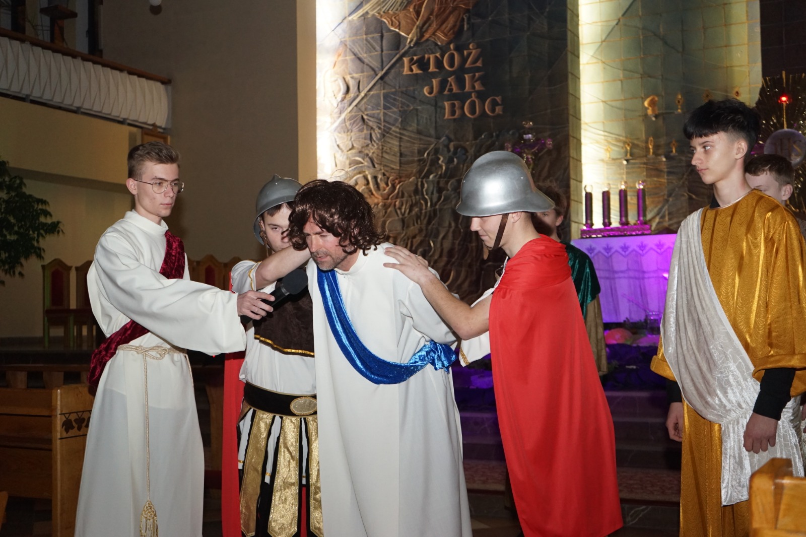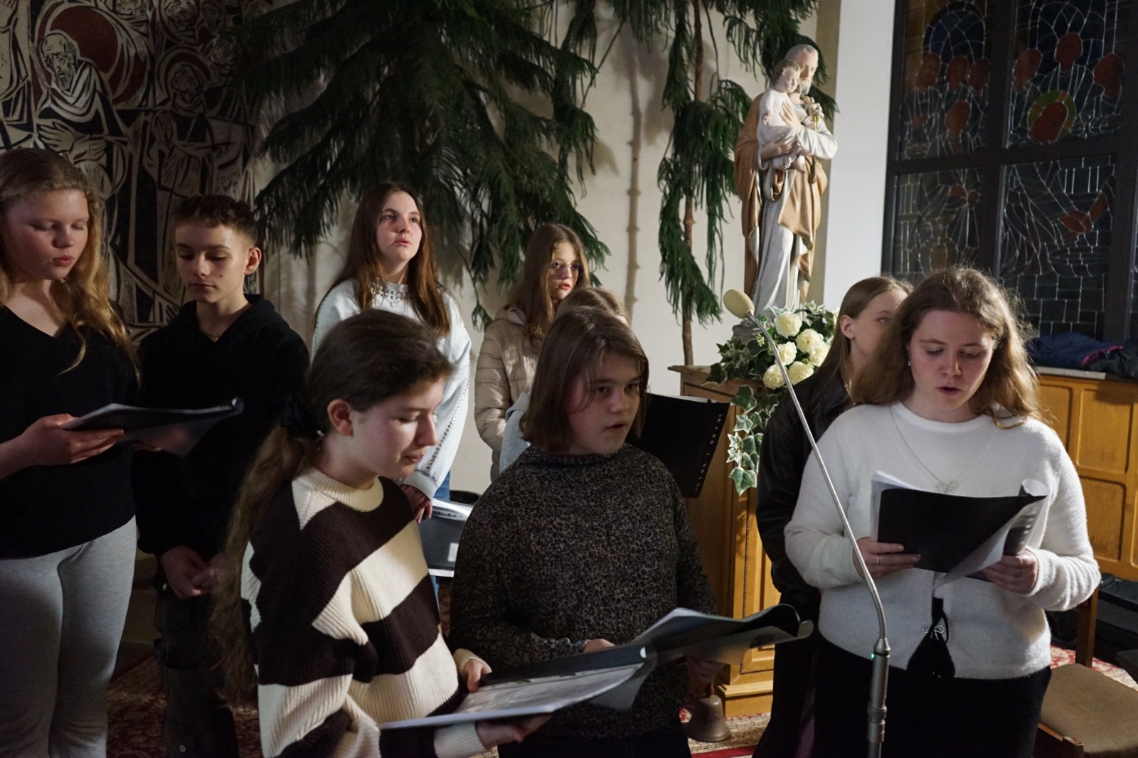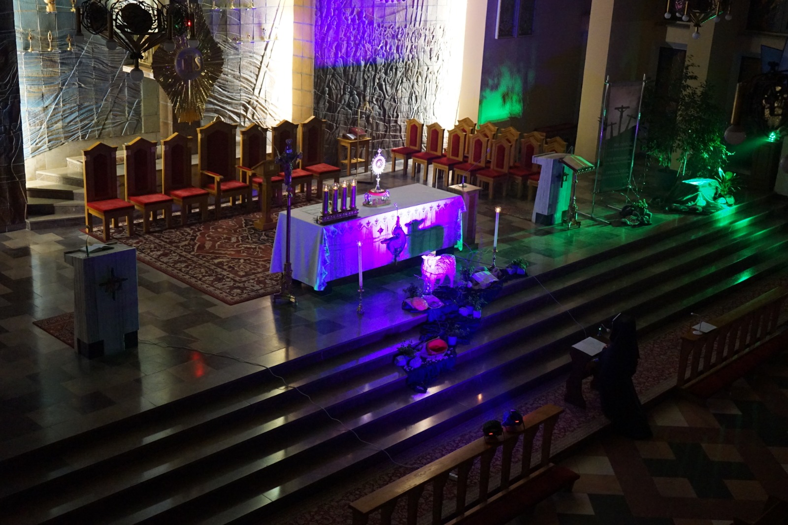 Po zakończeniu tych prezentacji, diakon Przemysław Kotuła wyniósł Najświętszy Sakrament do adoracji. Całość wieczoru uwielbienia została przygotowana przez ks. Adriana Kalka wraz z Liturgiczną Służbą Ołtarza. Oprawę muzyczną wydarzenia poprowadziła schola, a w śpiew włączyli się również księża naszej parafii: ks. Andrzej Cag, ks. Krzysztof Mikulski oraz ks. Rafał Choda.