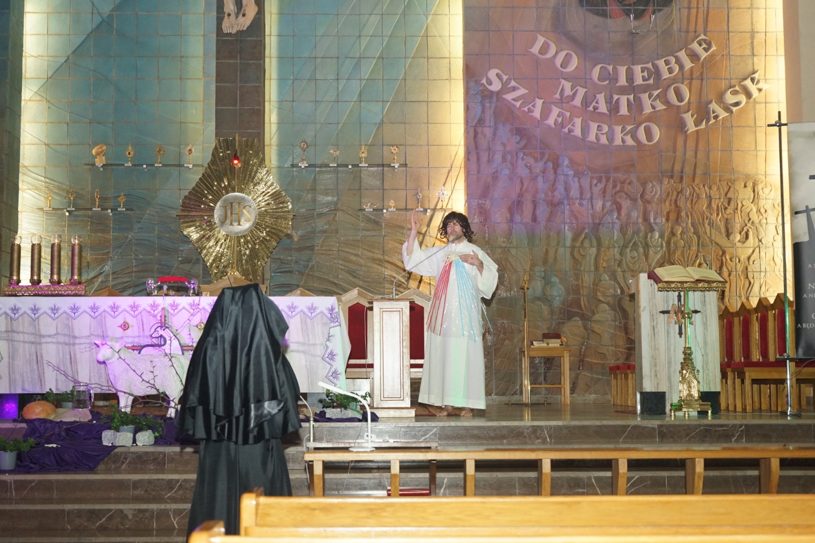 Po słowach wprowadzenia rozpoczęto prezentację poszczególnych wzorów modlitwy. Jako pierwsza przywołana została postać Maryi, która wypowiedziała słowa hymnu Magnificat. Następnie uczestnicy mogli wysłuchać i zobaczyć sceny ewangeliczne przedstawiające modlącego się Pana Jezusa – uczącego apostołów modlitwy „Ojcze nasz” oraz zanoszącego prośby do Boga w Ogrójcu. W dalszej kolejności przypomniano postać św. siostry Faustyny oraz Pana Jezusa Miłosiernego, który uczył ją odmawiania Koronki do Bożego Miłosierdzia. W rozważaniach pojawiła się również postać papieża Leona modlącego się o pokój na świecie, a także św. Faustyna, która modliła się o owoce trwającej peregrynacji obrazu Jezusa Miłosiernego w diecezji sandomierskiej.