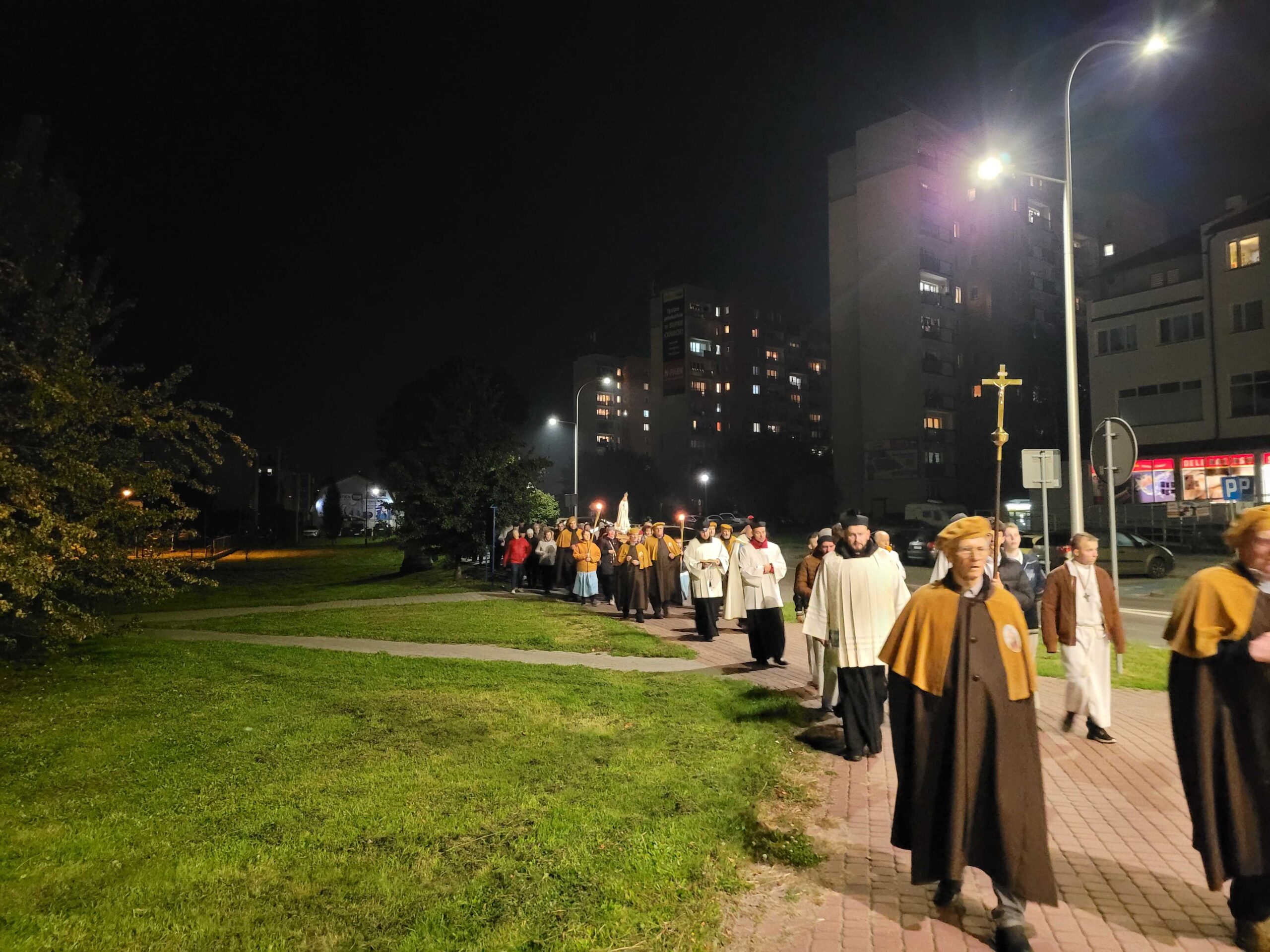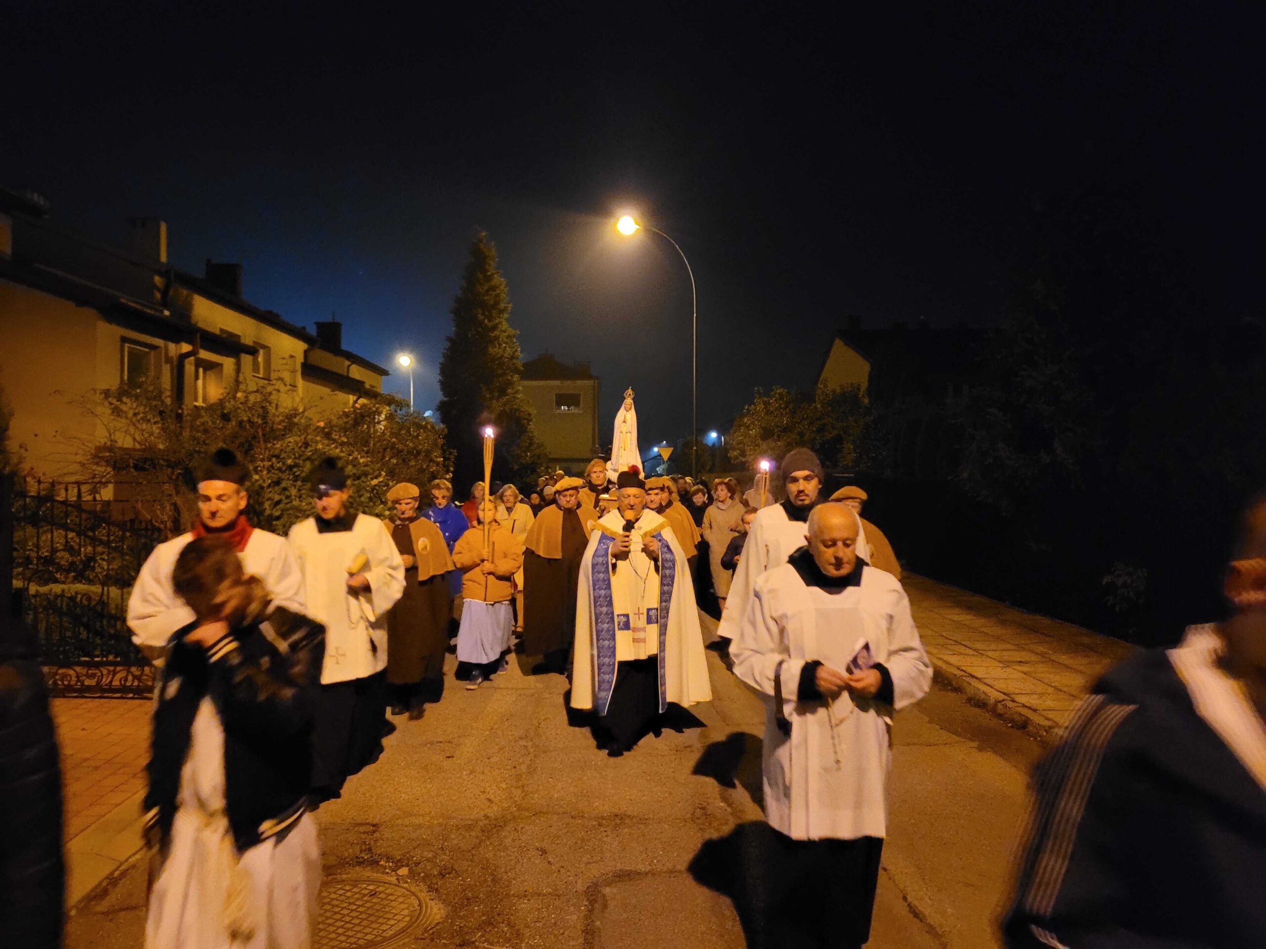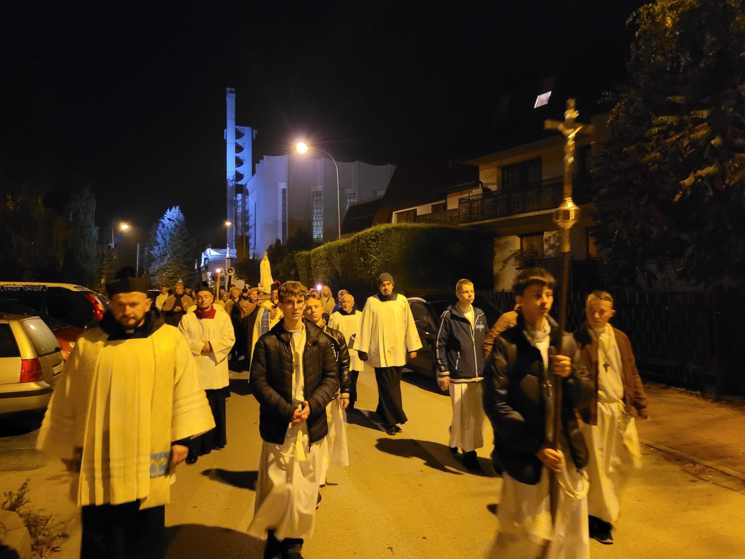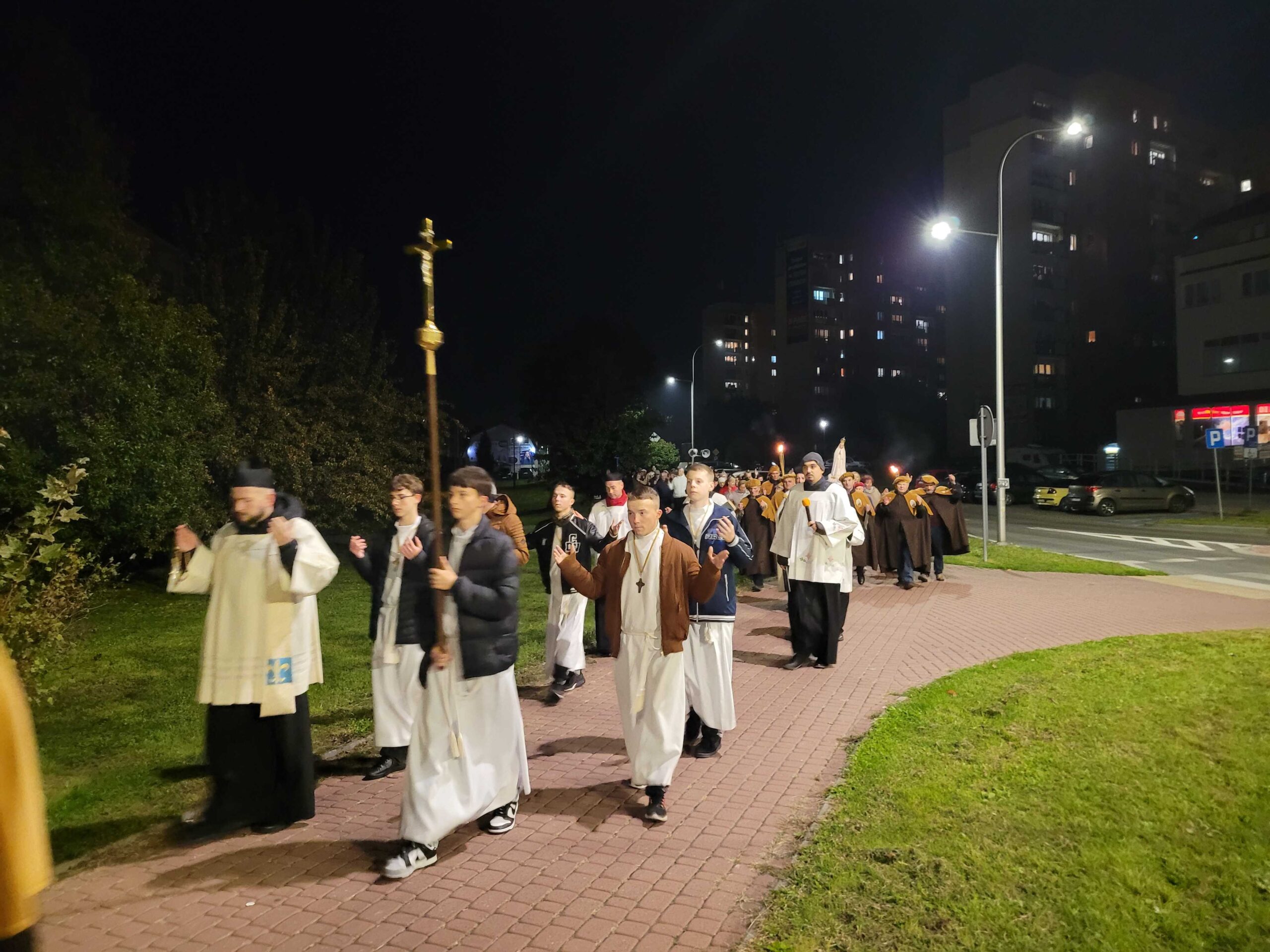 Po zakończonej liturgii, z kościoła wyruszyła procesja fatimska. Figura Matki Bożej, niesiona na ramionach mężczyzn, została oświetlona blaskiem świec trzymanych oraz licznie zgromadzonych parafian. Idąc ulicami serbinowskiego osiedla, wspólnie odmawialiśmy różaniec, powierzając Maryi nasze rodziny, parafię i wszystkie trudne sprawy współczesnego świata.